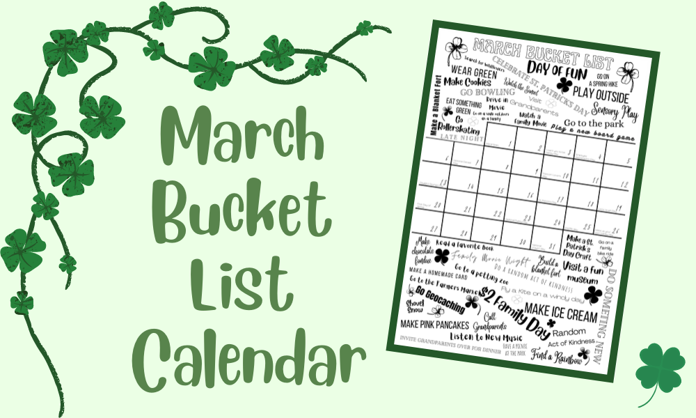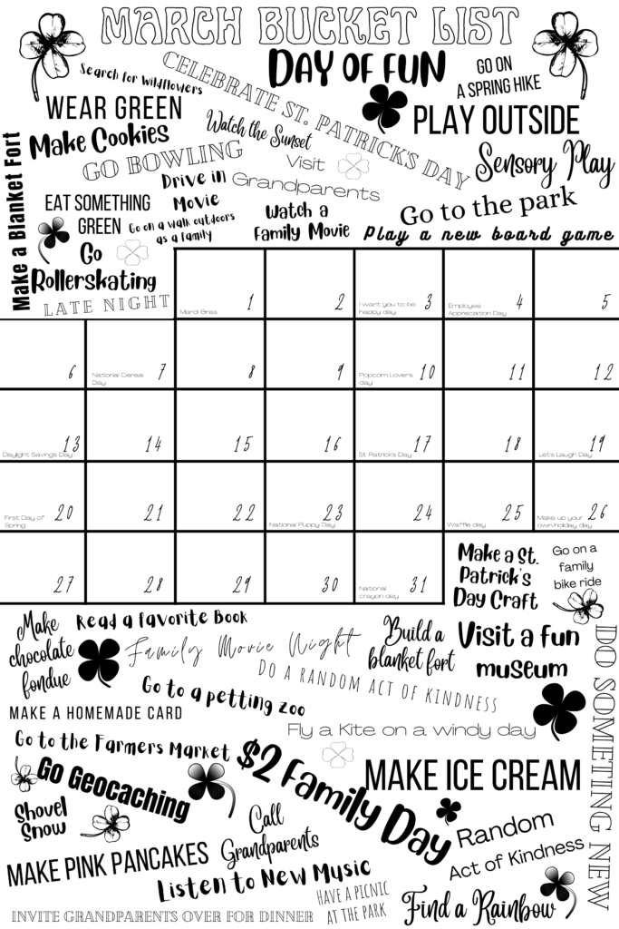 It’s here friends! Print your own March 2022 Bucket List Calendar and get ready to celebrate all month long! I print the Bucket list 24 inches X 36 inches at Alphagraphics, but any place that prints large prints will do them. We hang ours in the kitchen where we can all see it every morning while eating breakfast and it makes for a fun start to each day!