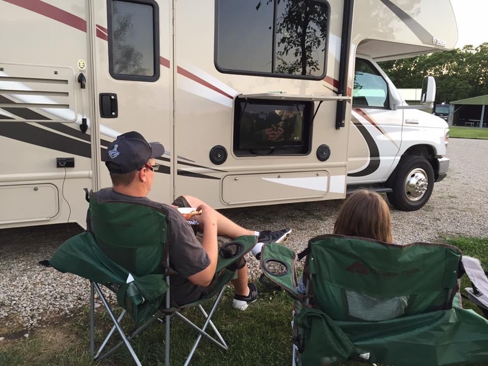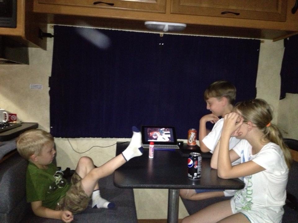 Though far from tent camping, our first RV rental was pretty basic, with no real bells and whistles. It still had air conditioning, a shower, a refrigerator, and a microwave, but there was no TV. We had a major storm one evening, and we all sat crowded around a tiny portable DVD player watching a movie. Not really ideal for 5 people.