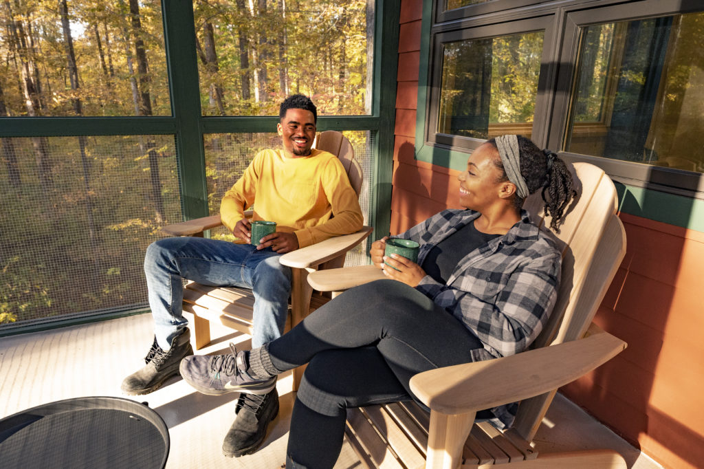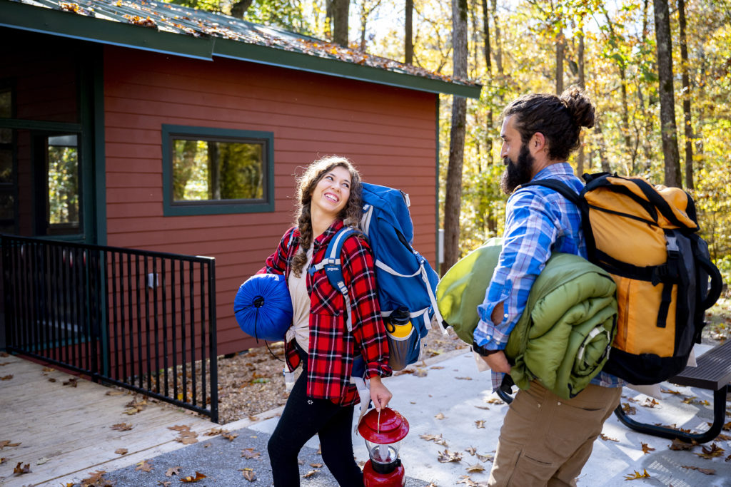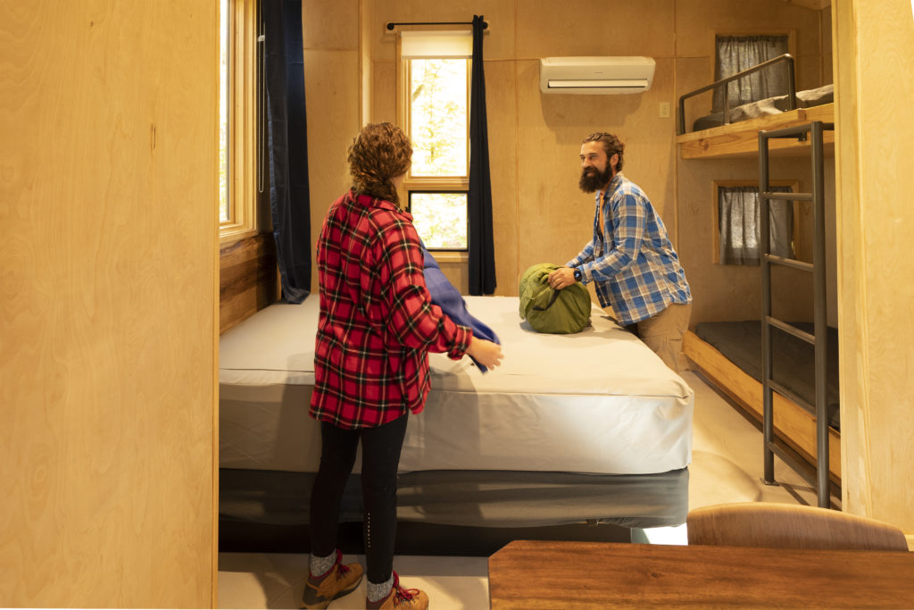 The design inspiration for the five camper cabins is the shipping containers often seen making their journey on the Mississippi River. Large windows and a screened-in porch provide an immersive experience, allowing guests a front-row seat to the night sky and forest surrounding the cabins. The camper cabins have a queen bed and bunk beds, dining table, heating and air conditioning, outdoor grill, fire pit, and picnic table. The four-unit bathhouse with hot showers, dressing area, sink, and toilet is within eyeshot.