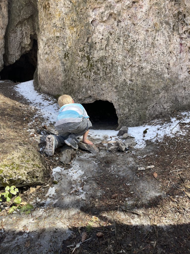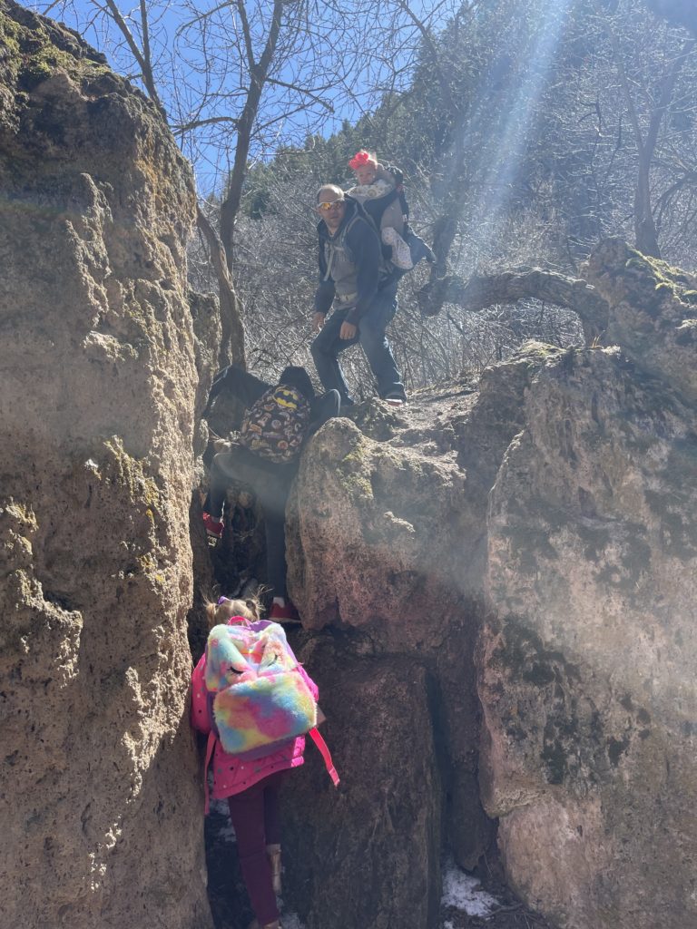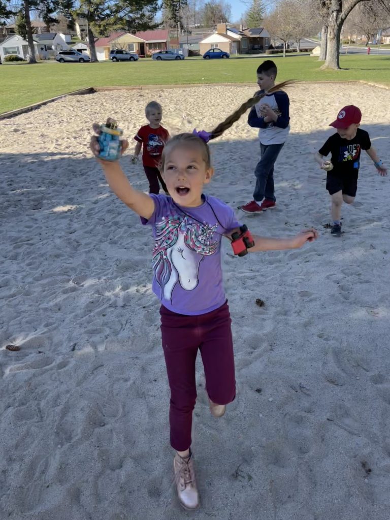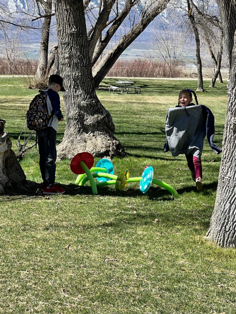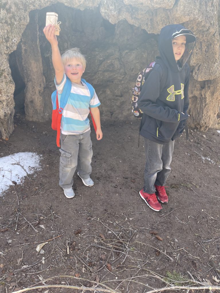 Our first stop was down by the river where the kids had to find 10 river rocks and stack them as high as they could. They also found their first item on the scavenger hunt: the arrowhead! (I made the arrowhead out of salt dough and a pink jewel that I shaped it around.)