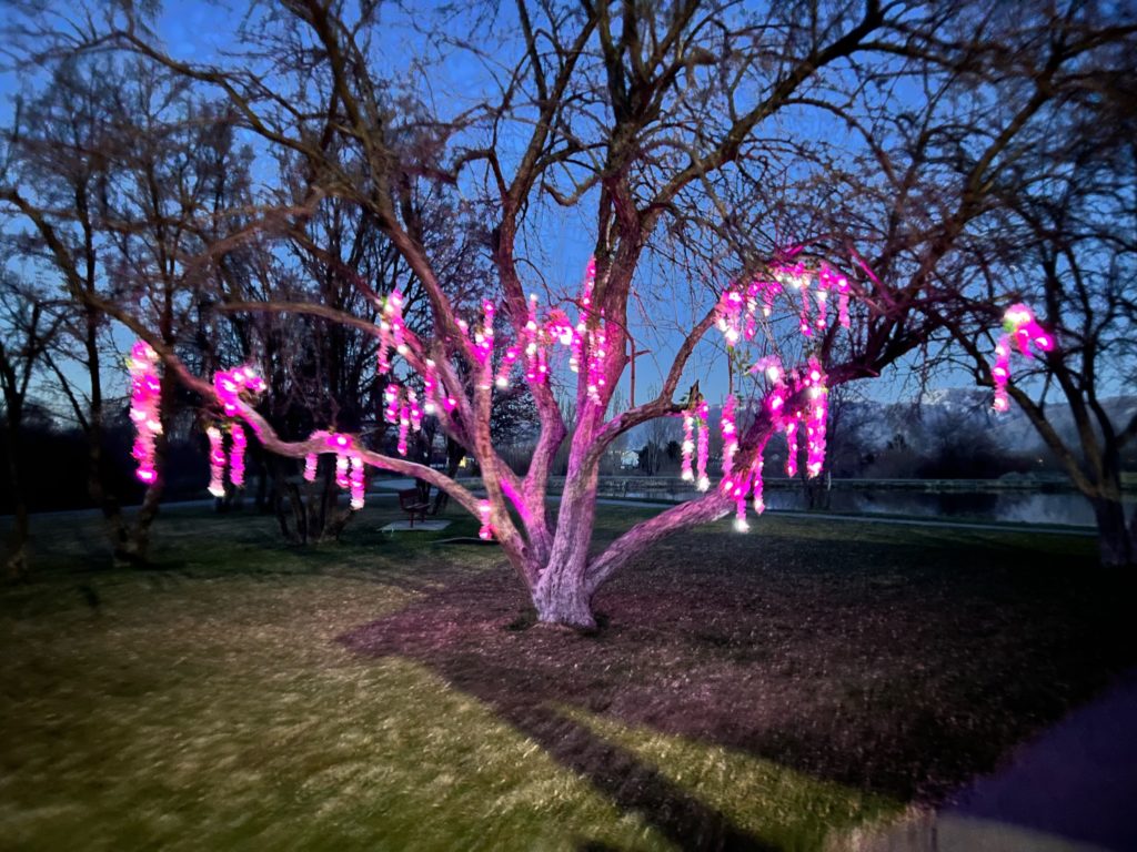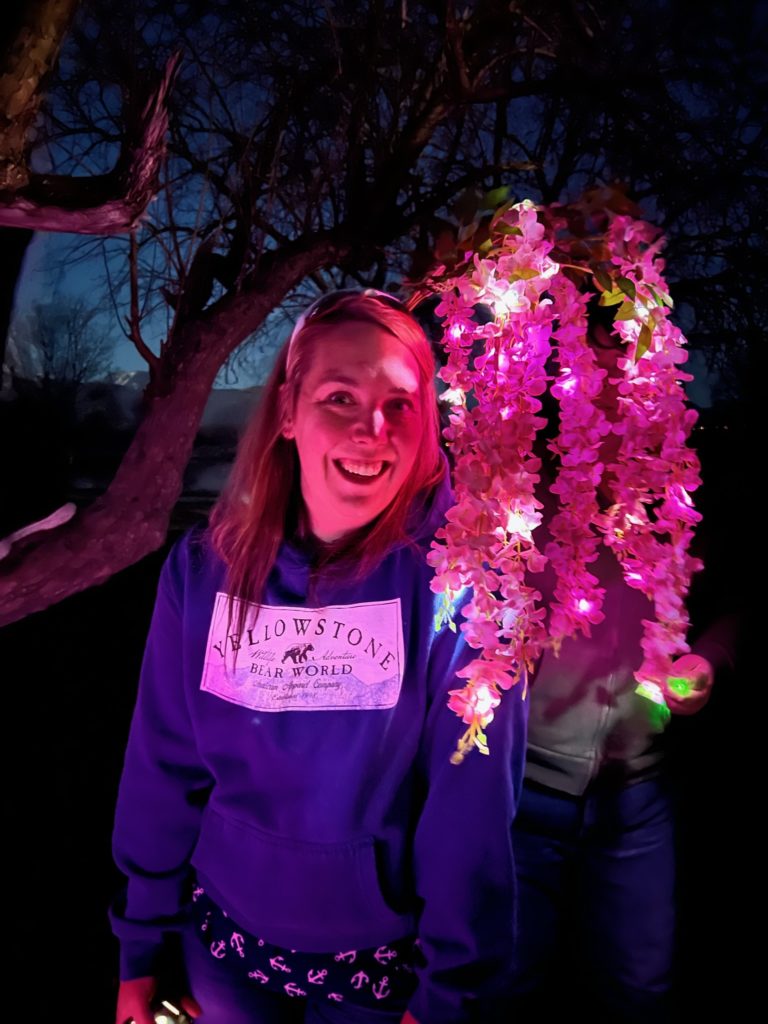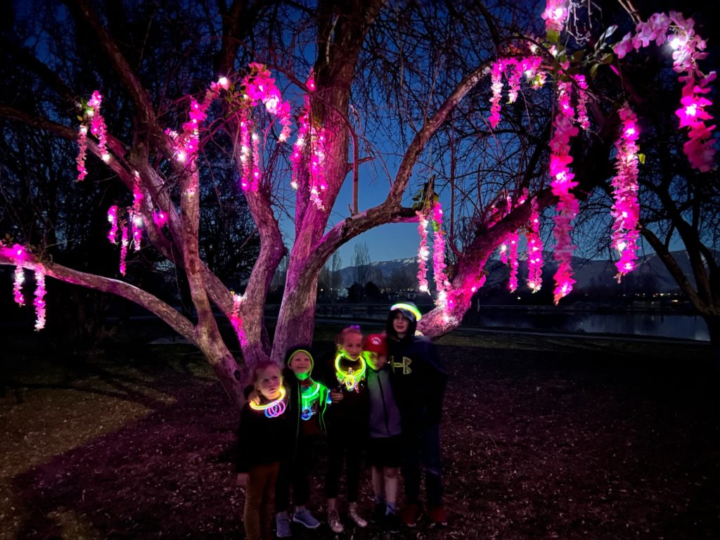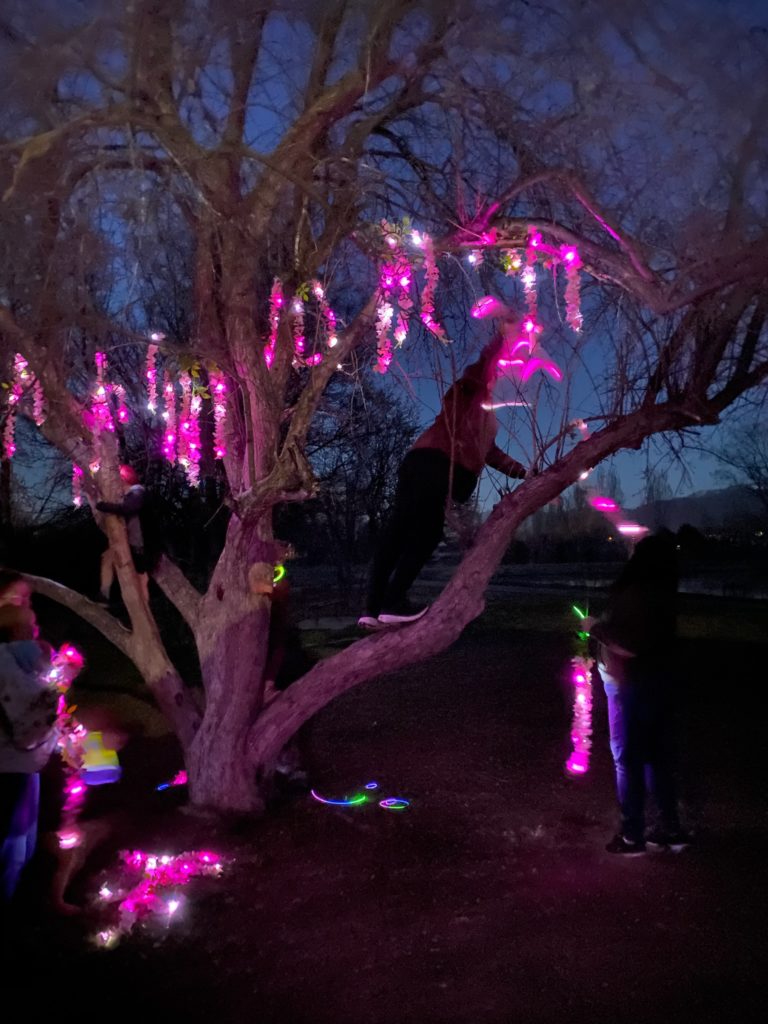 The ending was by far the best part! We got to the “Tears of the Moon”, they cracked open the arrowhead and found the jewel in time to light up the tree. (200 balloon lights hot glued to flowers the night before and hung in the tree).