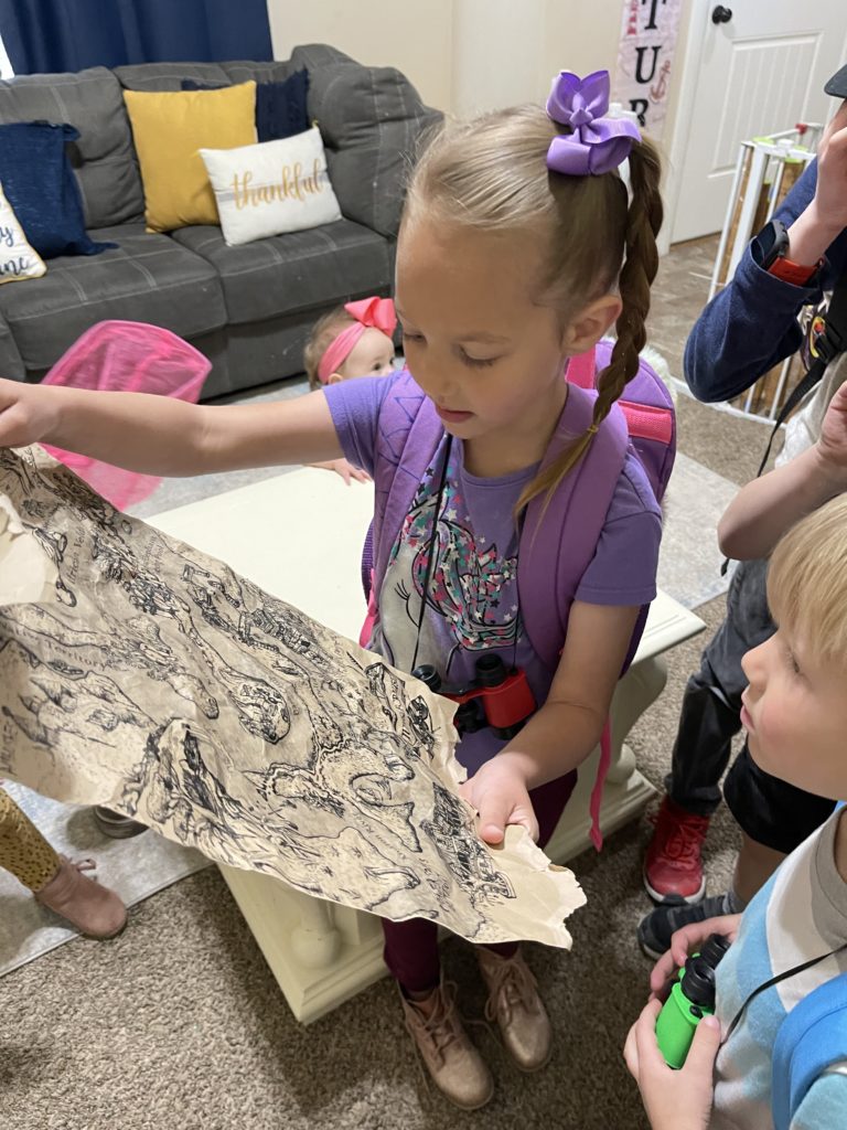 Once our backpacks were loaded with our lunches, snacks, binoculars, butterfly nets, and other jungle necessities, we headed out on our adventure. The kids looked at the map and helped us figure out where we needed to go.