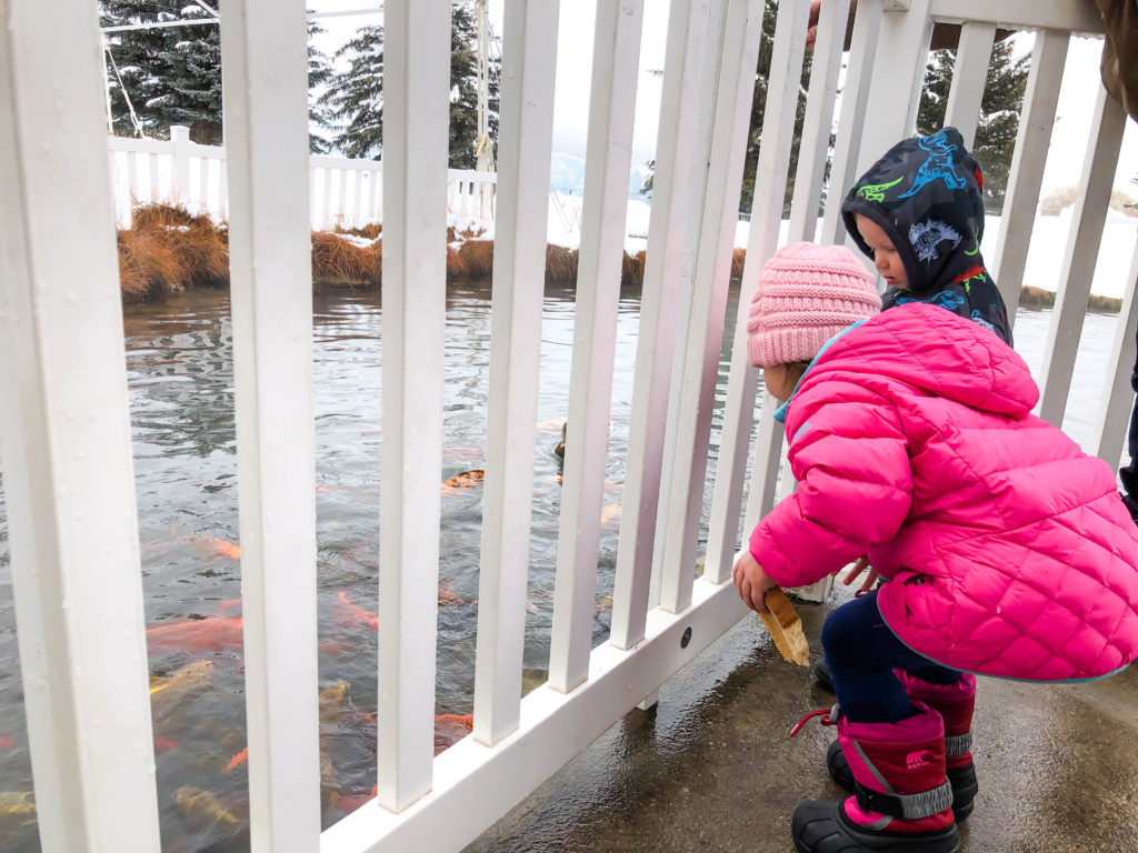 The next day, a friendly staff member brought us bread to feed the fish. They had these fun bright colored fish outside in a pond that came right up where the kids could see them, even in the middle of winter. The kids loved throwing the bread to them. We ended up spending a good amount of time just walking around the grounds and playing in the snow outside our “Snow House”. My daughter still tells people about our snow house and how much she misses it.