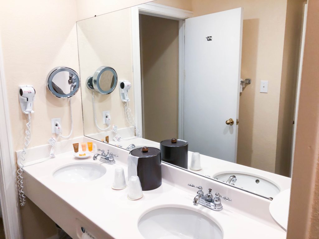 It was the most peaceful and quiet night. We were so comfortable with an adjustable temperature in our rooms and comfy beds to sleep in. The room also had a large closet, a double sink counter outside the bathroom, and seating near the front door. We had plenty of room for all our stuff to be hung and put away into drawers.