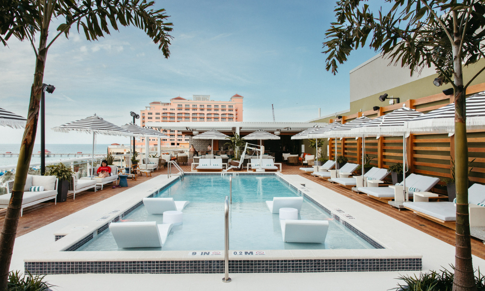 Amenities at The Hiatus include valet parking, a rooftop pool, two dining and three bar outlets, a state-of-the-art fitness center, and breathtaking views of Clearwater Beach.