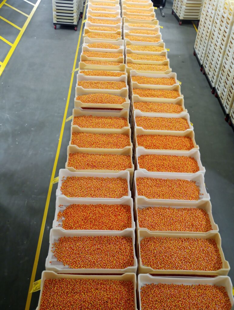 If you visit the factory prior to a holiday season, you’ll notice the company gearing up with their most popular candy pieces. In the middle of August we witnessed hundreds of thousands of candy corn waiting for packaging.