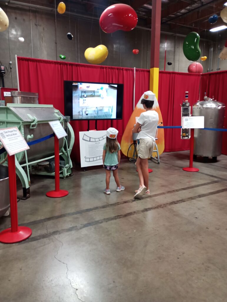 While touring the factory, you’ll get a peek at every step of the process; from the squishy centers to the bright colored shells, to the packaging. The kitchen was a main source of wonder for my kids! They especially loved watching the workers add the coloring to the outer shells–they’re so bright and shiny!
