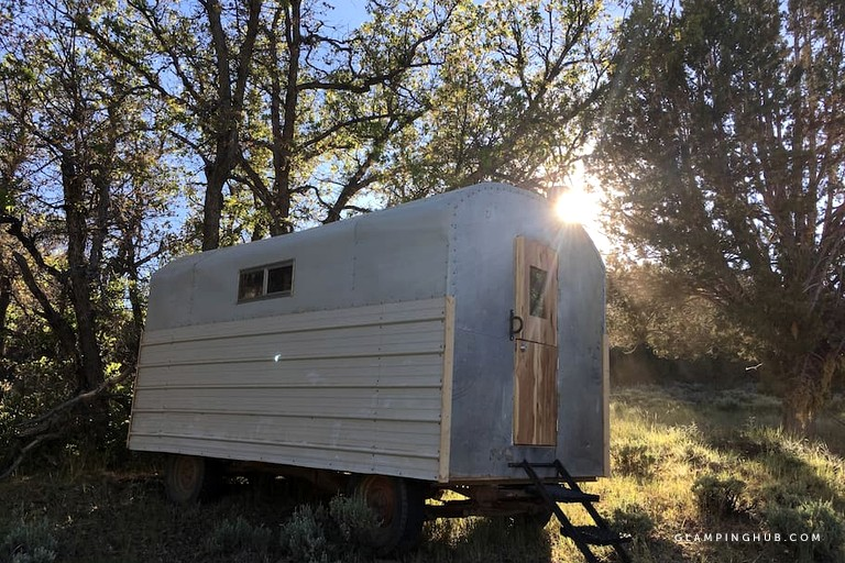 These two comfortable caravan rentals sit side-by-side near Zion National Park, Utah, and can accommodate six guests. The first caravan has a bed that sleeps two. In the second caravan, guests will find a bed for two on top, with an additional pull-out bed on the bottom. There is also an adorable table where four people can comfortably sit. Outside, a shared walk-in solar shower is available, as well as an outhouse toilet. Linens and towels are provided. A shared common area holds a wood-fire stove, as well as a small kitchen area with dishes, pots, pans, plates, cups, utensils, propane, firewood, and a cooler. The caravans are settled on a gorgeous, sprawling meadow with views of Southern Utah’s cliffs in the distance. There is a fire pit that glampers are welcome to use, as well as a horseshoe pit and multiple hammocks hanging through the property. Book Now