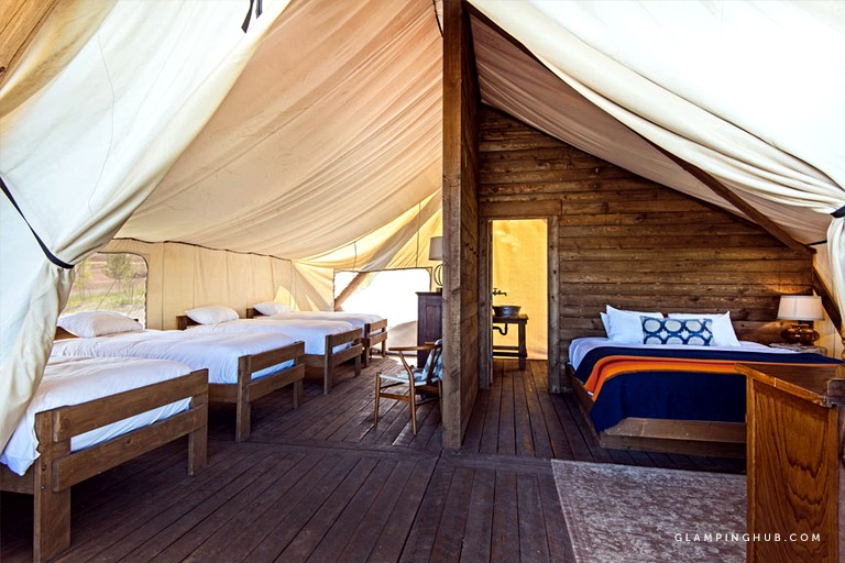 An incredible escape for both couples and families, these luxurious safari tent rentals on picturesque Bear Lake, Utah, are a nature lover’s dream. Inside, guests will have electricity, a full bathroom with a shower, a heater, and elegant furnishing. Guests will have access to a private campfire, a mini-fridge, and a safe for valuables during their outdoor getaway. There are two types of safari tent rentals available: the Grand Couple’s Tent and the Six-Person Family Tent. The Grand Couple’s Tent comes with one bedroom tent and is furnished with a king-sized bed. The Six-Person Family Tent has two bedrooms and comes furnished with one king-size bed and four twin-size beds. Book Now