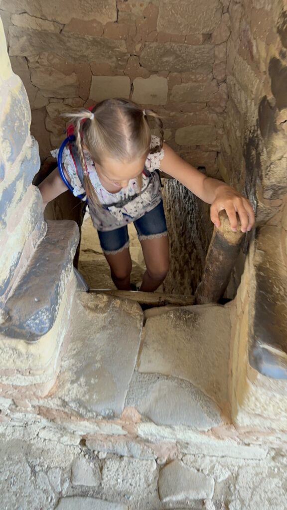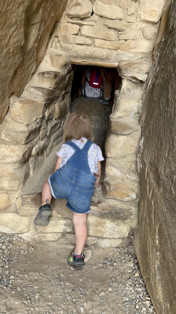 They ask that when climbing ladders that children are able to climb without assistance. If they are small enough to be in a backpack carrier that is ideal. Our two year old did both – for one ladder she was sleeping so I carried her on my back, for the second ladder she was awake and climbed herself (and was quite proud). One thing to note if you do wear a backpack carrier, there were two places where I had to take it off and push it through because it was too big to fit through on my back.